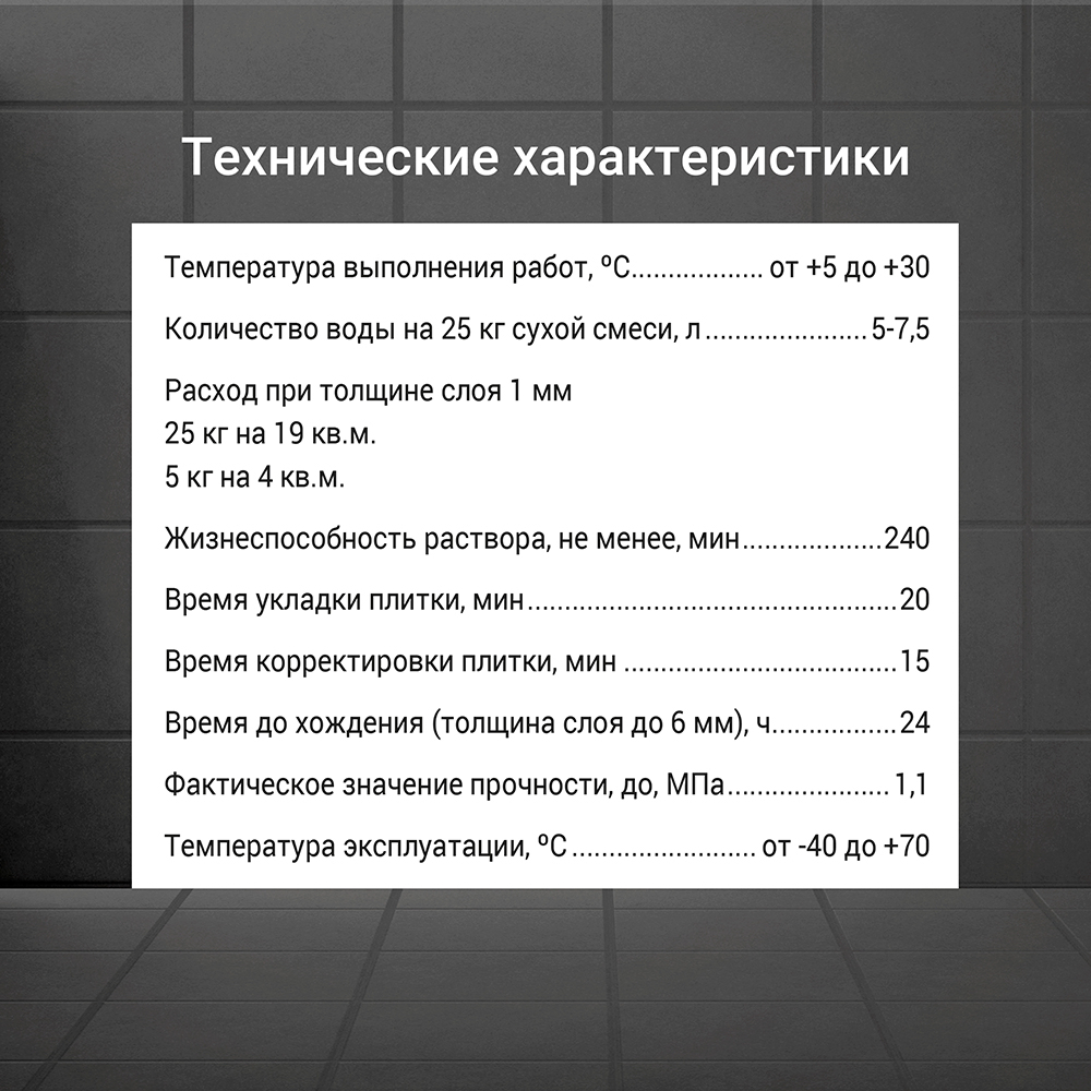 Усиленный клей для укладки всех видов керамической, легкой каменной плитки с нормальным водопоглощением (более 5%) форматом до 60х60 на полы и стены внутри сухих и влажных помещений. Может также применяться для базового выравнивания поверхностей слоем до 15 мм.