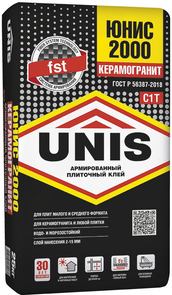 UNIS 2000 — хороший клей по соотношению цена/качество. Легко замешивать, не комкуется. Подошёл для плитки 60x60 см. Через месяц — без изменений. Удобная упаковка — не сыпется.