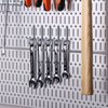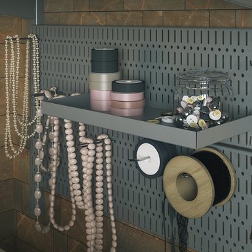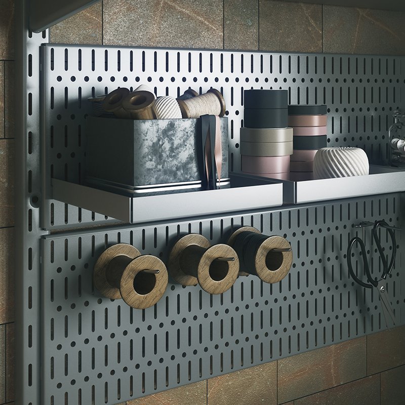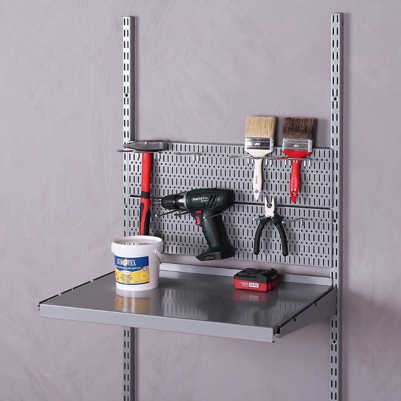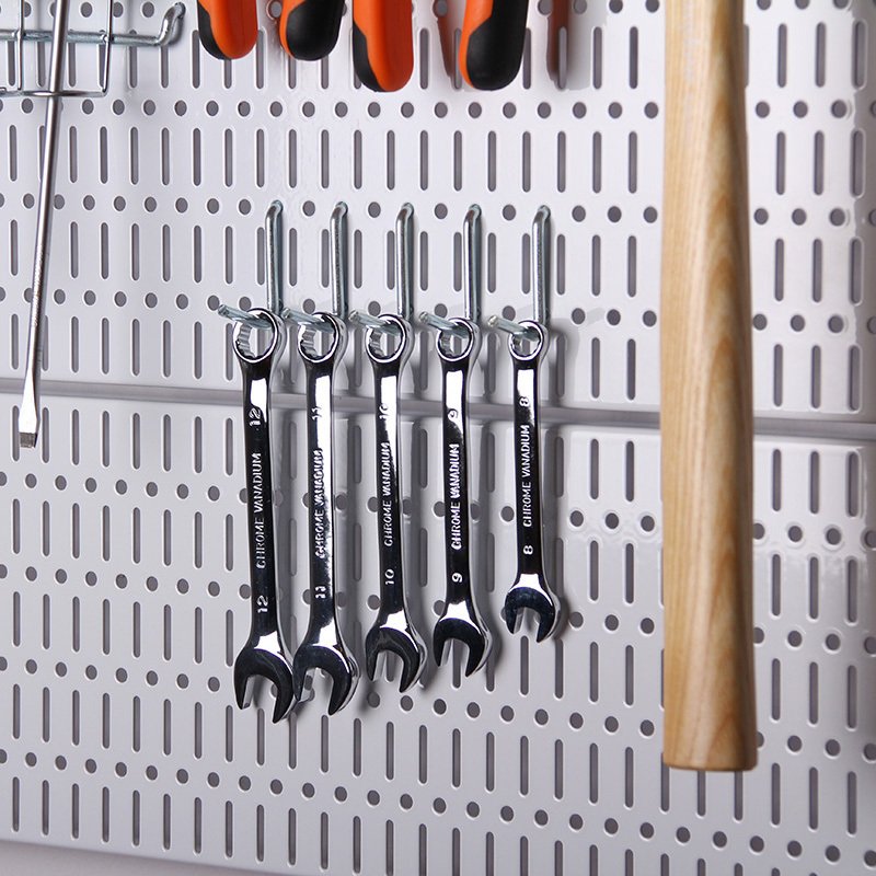 Перфорированная панель - интересное решение для вертикального хранения инструментов, бытовых принадлежностей и прочих предметов, позволяющее размещать большое количество вещей на малом пространстве. Принцип устройства перфорированной панели подобен принципу навешивания кронштейнов на стойки перфорации, но роль кронштейнов в данной ситуации выполняют крючки.