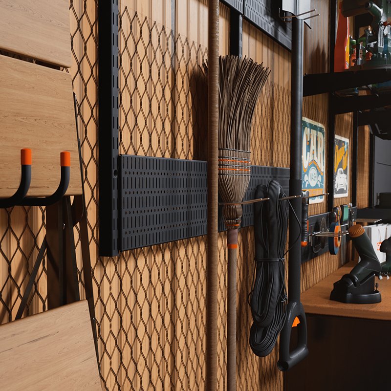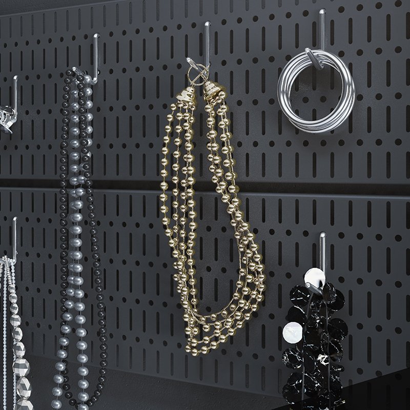 Перфорированная панель - интересное решение для вертикального хранения инструментов, бытовых принадлежностей и прочих предметов, позволяющее размещать большое количество вещей на малом пространстве. Принцип устройства перфорированной панели подобен принципу навешивания кронштейнов на стойки перфорации, но роль кронштейнов в данной ситуации выполняют крючки.