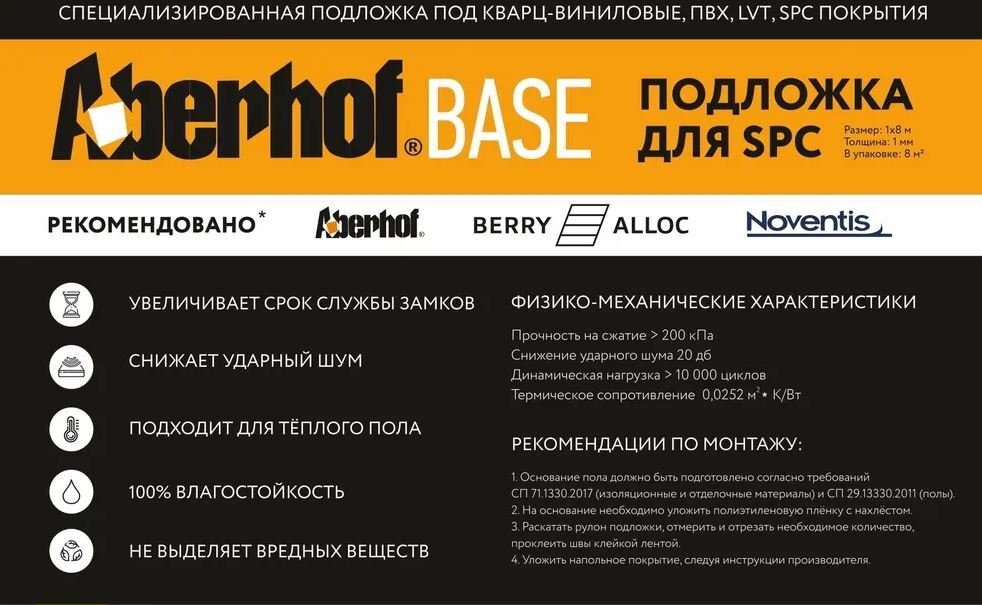 Подложка Aberhof BASE изготовлена из современного материала IXPE, и обладает отличной прочностью на сжатие – это гарантия долговечности замков SPC. Подложка Aberhof BASE заметно улучшает комфорт в помещении за счет снижения уровня отраженного шума в 20 Дб. Подложку Aberhof BASE можно укладывать вместе с системами подогрева пола при температуре нагревательного элемента <28 градусов.