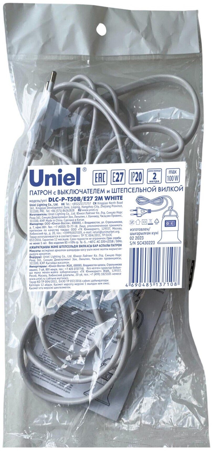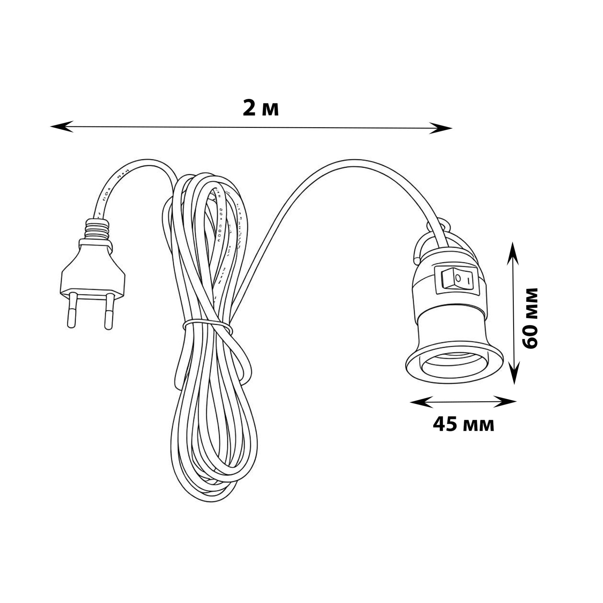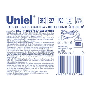 - Патрон подвесной с выключателем и штепсельной вилкой DLC-P-T50B/E27 2M WHITE