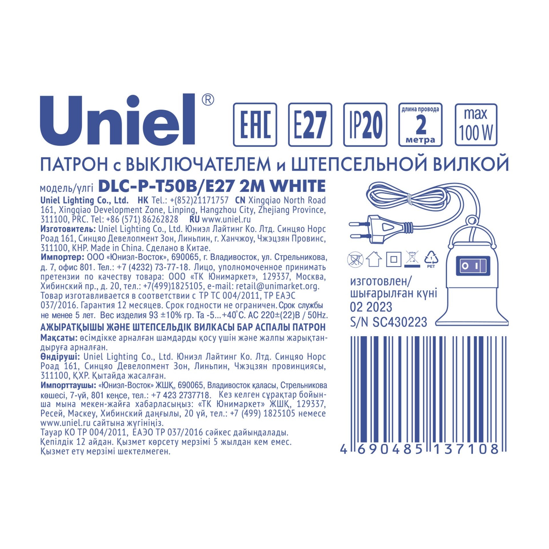 Патрон подвесной с выключателем и штепсельной вилкой DLC-P-T50B/E27 2M WHITE — устройство для подключения фитоламп и ламп общего назначения.