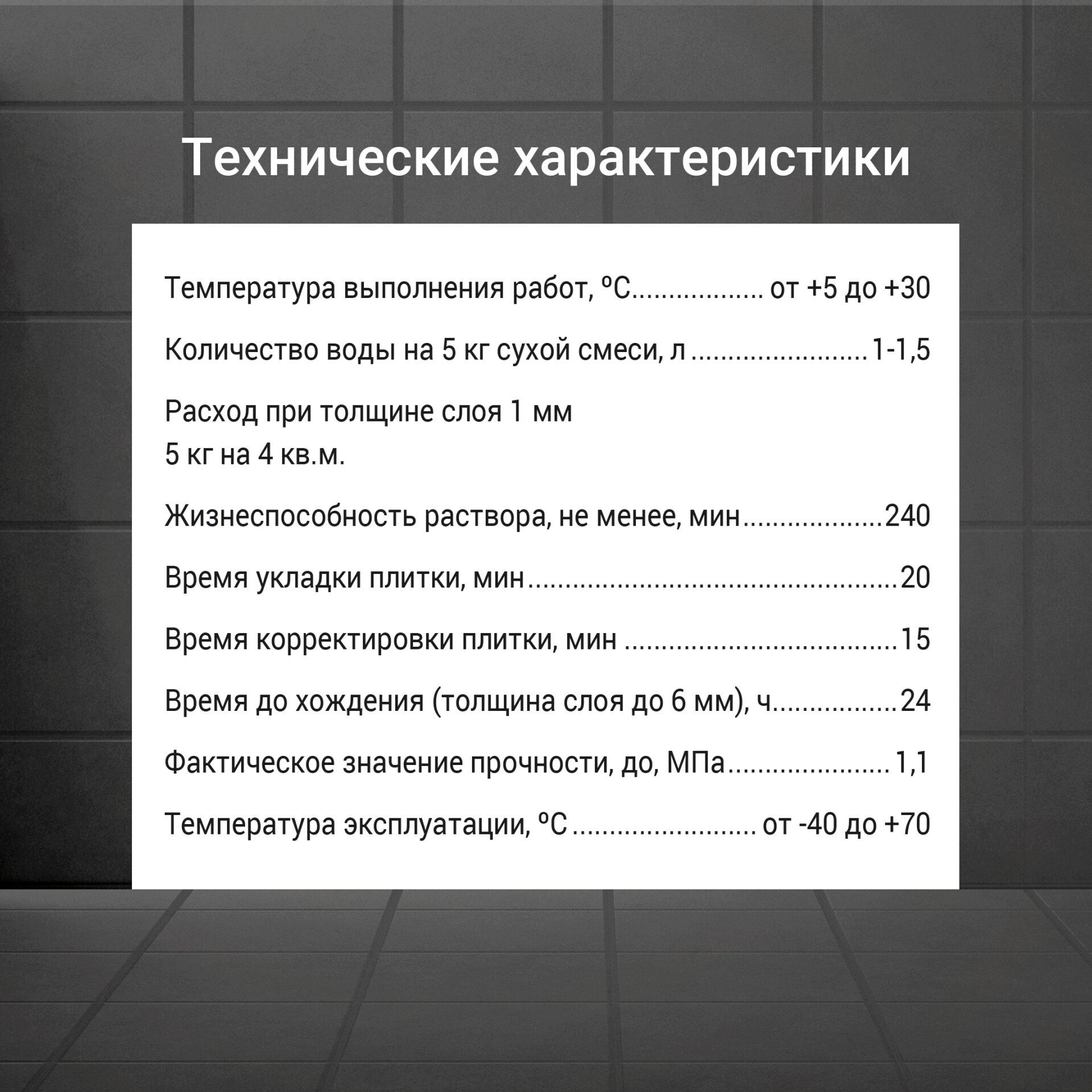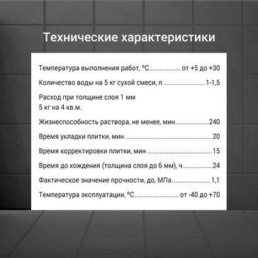 Усиленный клей для укладки всех видов керамической, легкой каменной плитки с нормальным водопоглощением (более 5%) форматом до 60х60 на полы и стены внутри сухих и влажных помещений. Может также применяться для базового выравнивания поверхностей слоем до 15 мм.